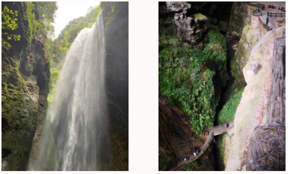 游覽完天生三橋,便前往龍水峽地縫。龍水峽地縫是億萬年前地殼變遷而形成的狹長山谷,屬典型的喀斯特地貌景觀,峽谷全長5公里。我們踏上了地縫石階,從山頂俯瞰峽谷,峽深壁立,薄霧如紗,似幽邃夢境。棧道彎曲迂回,壁泉隨處可見,濺起薄薄的水霧,飄灑眼前,令人渾身直打寒顫。我們走了幾程,忽見前面不遠處崖壁上飛瀑流泉,狹窄的棧道無處藏身,飛逬的泉水淋濕了大家的頭發(fā)。此時棧道已經(jīng)十分濕滑,舉步維艱。我們不敢玩手機,都低頭認真觀看腳下的路,稍不留神就可能與大地來個親密接觸。鉆出蜿蜒曲折,狹窄悠長,鐘乳林立的天然地坑,走上地面,眼前豁然開朗,美好的武隆之旅也到此完美結(jié)束了,此刻美味的食物正敞懷迎接我們……